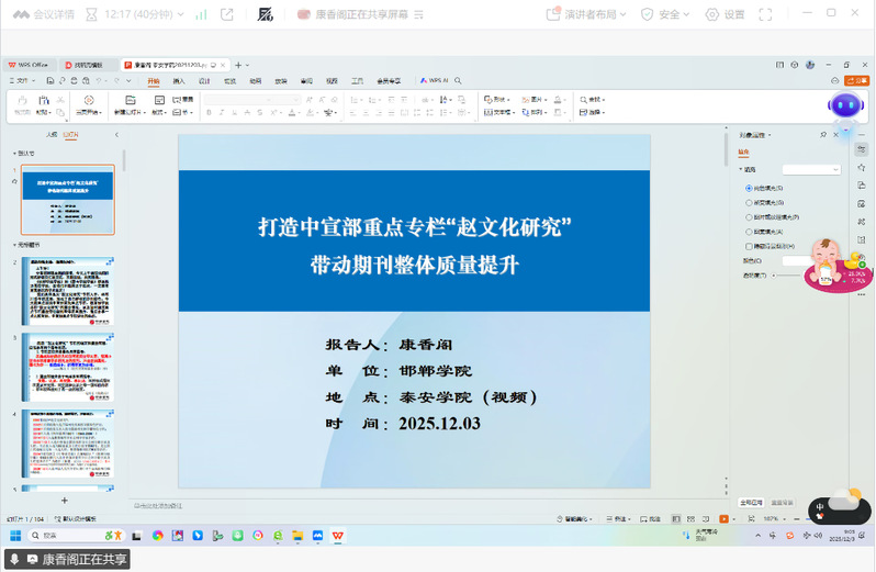为增进学术交流,推动重点栏目建设,12月3日上午,学报编辑部邀请邯郸学院康香阁编审围绕“重点专栏带动期刊整体质量提升”作线上专题报告。报告会由学报编辑部副主任梁凤鸣主持,学报编辑部全体人员参加。